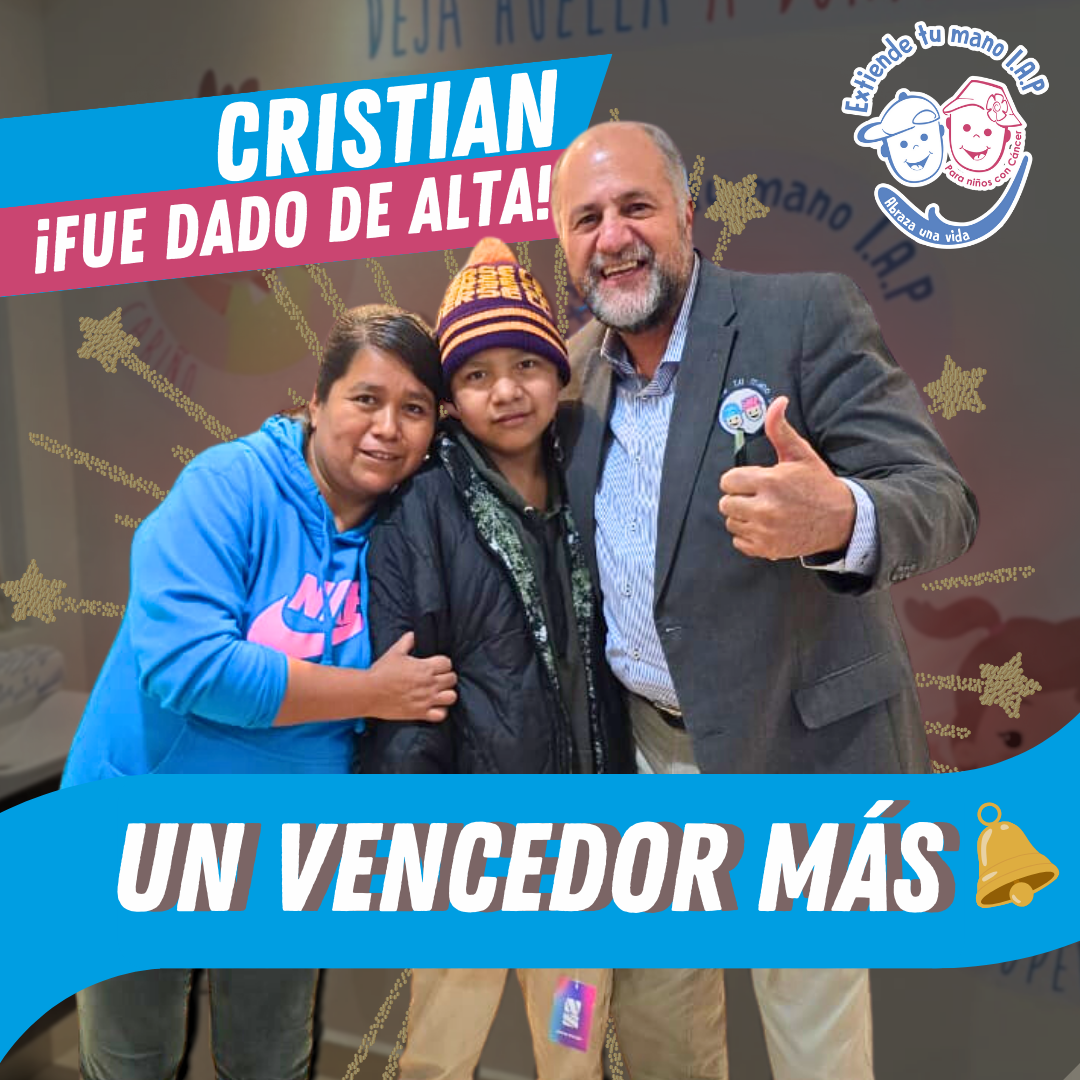 Soy Cristian, tengo 13 años y vivo en el municipio de Tejupilco. Estoy feliz estoy contento porque toque la campana y festeje en el hospital y salieron todos los doctores y me festejaron, gracias por apoya a Extiende tu Mano y a todos los niños con cáncer.